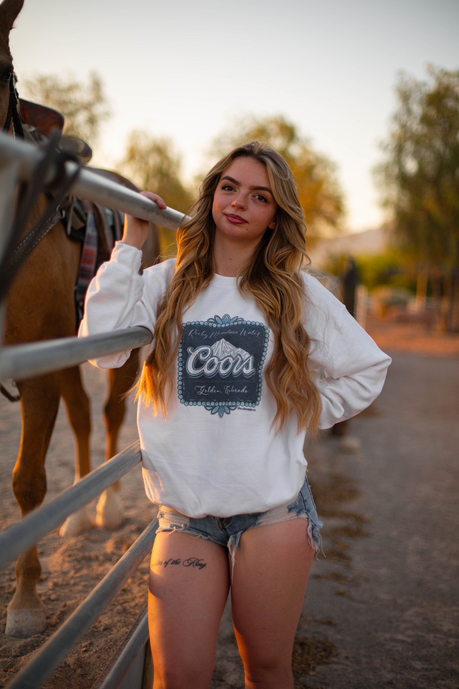 The Coors Crewneck in white.